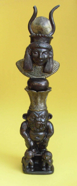 Bes & Hathor / ägypt. Gottheiten Tonfigur 50cm dem orig. Sistrum nachempfunden |
